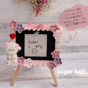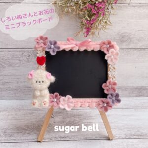 ピンクのリボンをつけたしろいぬちゃんと、フェルトで作ったお花を散りばめた、とってもラブリーなミニ黒板。