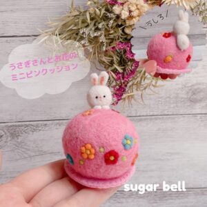 うさぎさんがちょこんと乗った小さなピンクッションです。