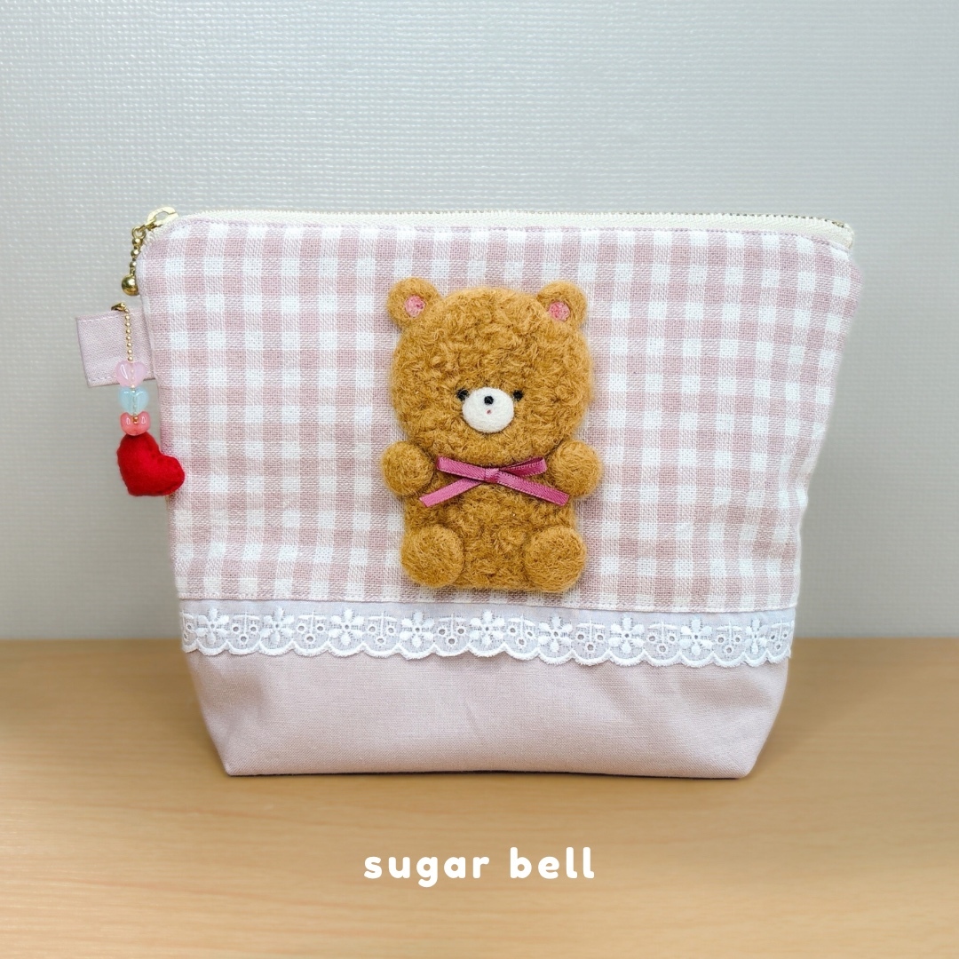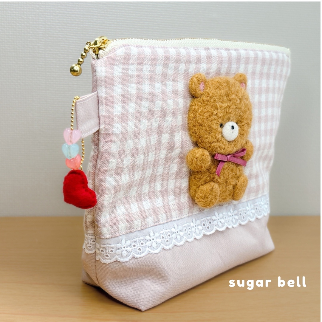 羊毛フェルトのくまさんをあしらった、 マチ付きポーチです。