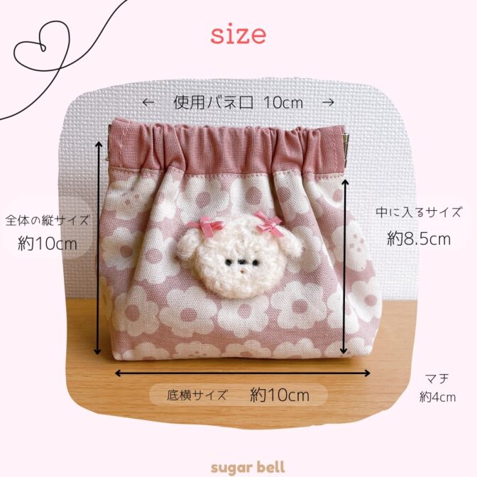 おみみリボンのもふもふわんこの羊毛フェルトモチーフをつけた、マチつきバネ口ポーチです。
